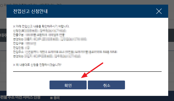 전입신고 내용을 확인 후 "확인"을 누릅니다.