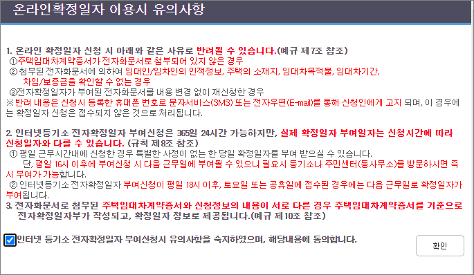 유의사항이 나오면 "인터넷등기소 전자확정일자 부여신청 시 유의사항을 숙지하였으며, 해당 내용에 동의합니다"에 체크하고 "확인"을 누릅니다.(개인의 경우 실명 확인이 가능한 전자서명 인증서가 있어야 한다는 내용이며 상가임대차계약이 아닌 주택임대차계약증서만을 대상으로 한다는 내용입니다.)