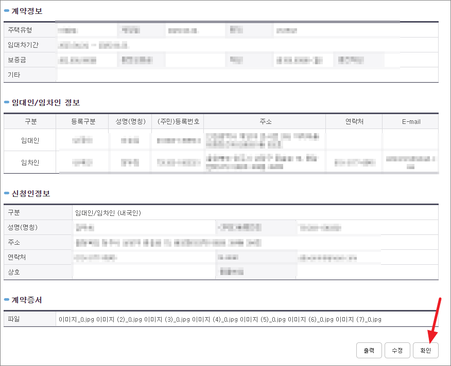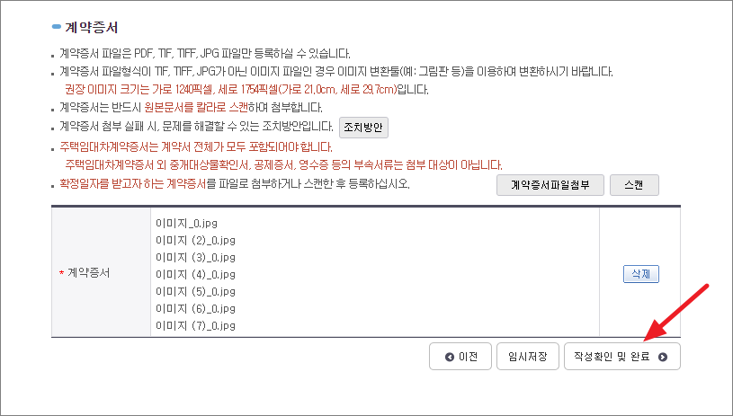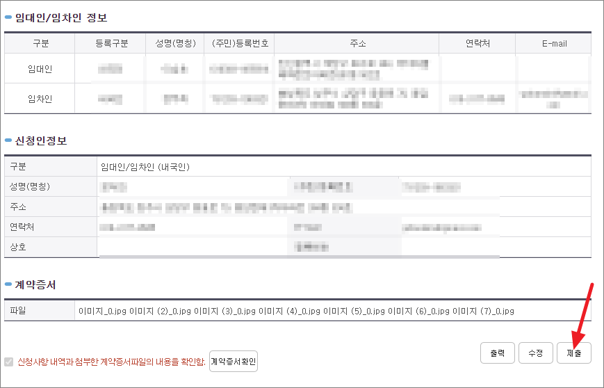 스캔한 문서와 입력한 내용을 최종 확인 후에 '제출'을 누르면 됩니다.
