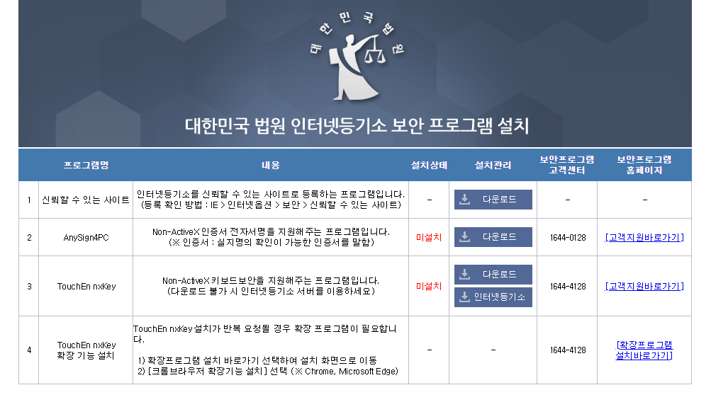 인터넷 등기소는 보안 프로그램이 필요한데요. 아래처럼 나오는 화면에서 "미설치"된 것의 오른쪽에 다운로드를 눌러서 보안프로그램을 설치합니다.