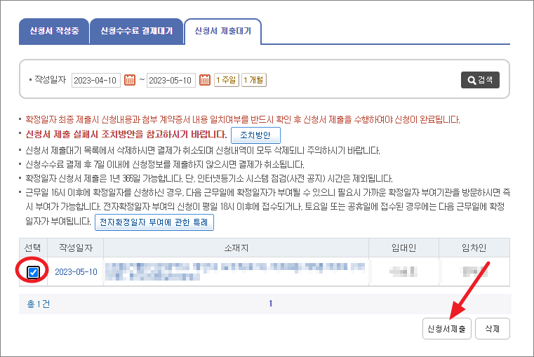 500원 결제를 했으면 다시 위 화면이 나오는데요. 여기서 작성한 문서에 체크로 선택을 하고 아래쪽에 '신청서 제출'을 누릅니다.