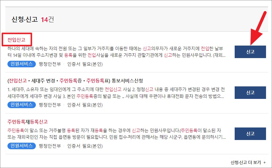 검색결과에서 나온 목록 중에서 '전입신고'의 오른쪽에 있는 '신고'를 누릅니다.