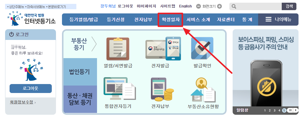 인터넷등기소 메인화면 상단에 '확정일자'를 누릅니다.
