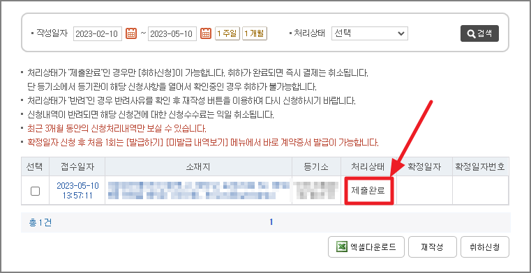 위 화면처럼 '제출완료'가 되었으면 확정일자 부여신청을 인터넷으로 성공적으로 마무리한 것입니다.