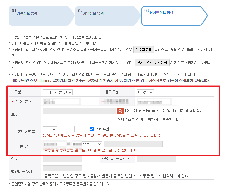 임대인/임차인 정보에는 임대인과 임차인 모두 입력해야 합니다.계약서 내용을 보고 그대로 입력합니다.