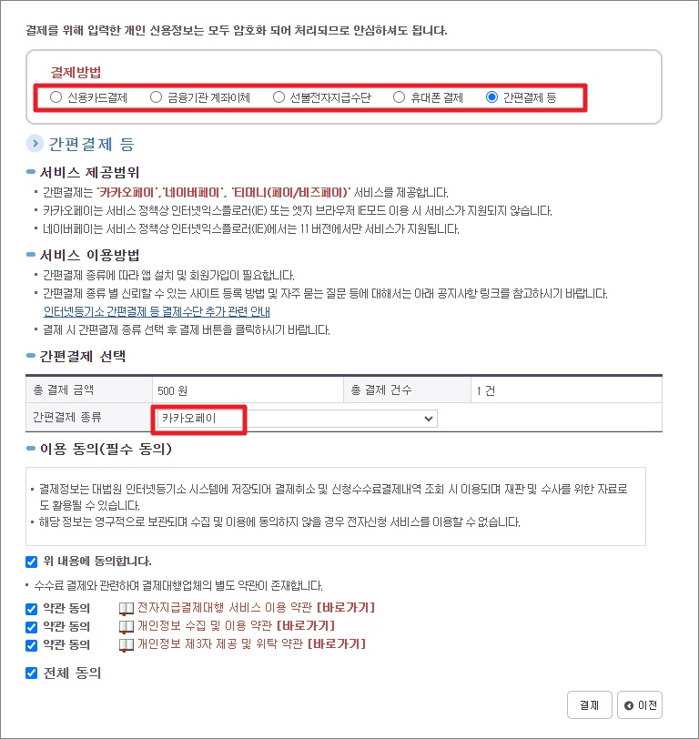 결제 수수료는 500원이며 결제방법은 편하신대로 선택하시면 됩니다. 여기서는 카카오페이로 결제하겠습니다.