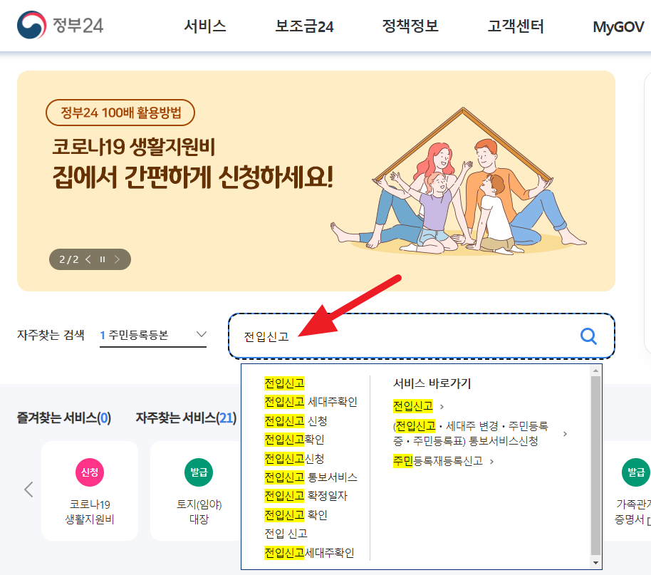 로그인 후 정부24 메인화면의 중앙에 있는 검색창에 "전입신고"라고 쓰고 검색합니다.