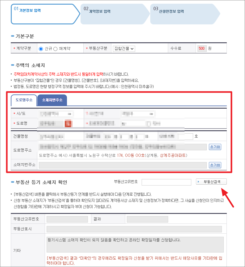 주소를 입력하고 부동산고유번호 옆에 있는 '부동산검색'을 누릅니다. 이 때 신청 부동산 소재지가 '부동산 검색'을 통해 확인되지 않더라도 계약증서상 소재지 및 신청정보가 정확하다면 그 사실을 신청인이 인지하고 신청함을 기타란에 기재하고 확정일자 부여 신청이 가능합니다.
