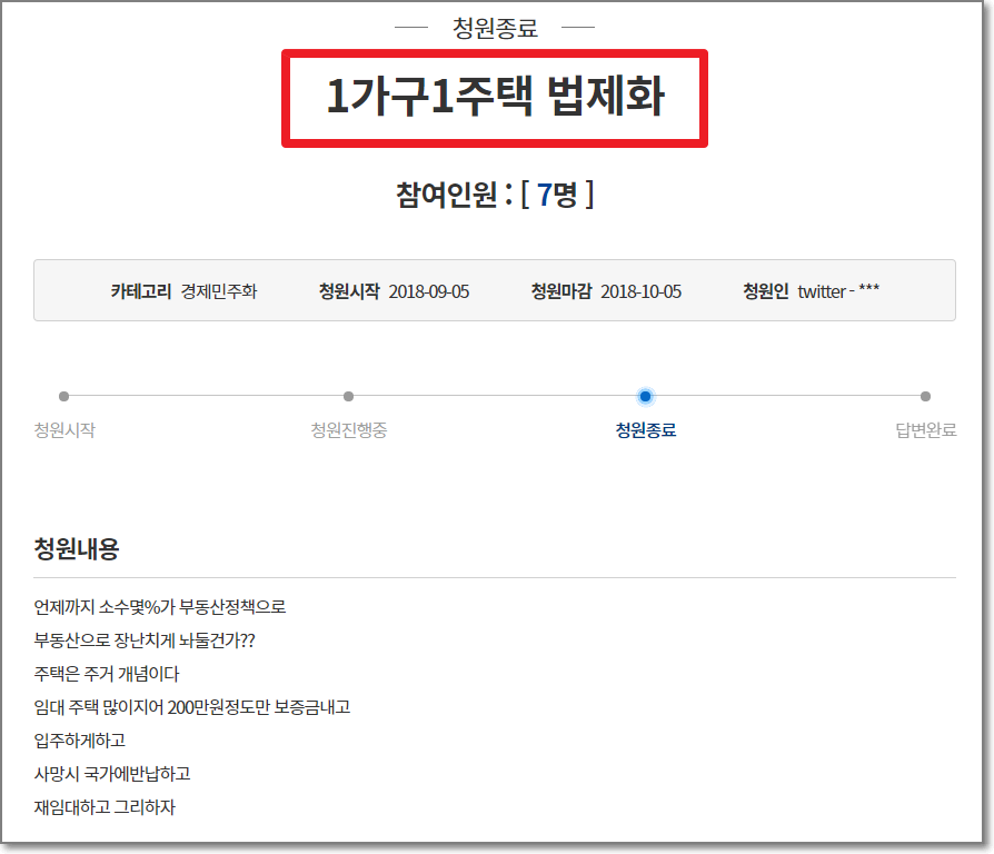 지난 몇년간 청와대 국민청원에 1가구 1주택 보유원칙을 법제화 하자는 청원이 올라온적이 몇번 있습니다.