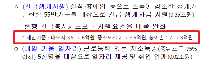 코로나로 소득 감소가 발생해 생계가 어려워졌으나 다른 지원 프로그램으로 지원받지 못하는 경우 지원 대상이 됩니다. 소득은 중위소득 75% 이하이며, 코로나 확산 이전과 비교해 소득이 25% 이상 감소했어야 하고, 재산은 대도시 기준 6억원, 중소도시 3억5천만원, 농어촌 3억원 이하인 가구이며 총 55만 가구입니다.