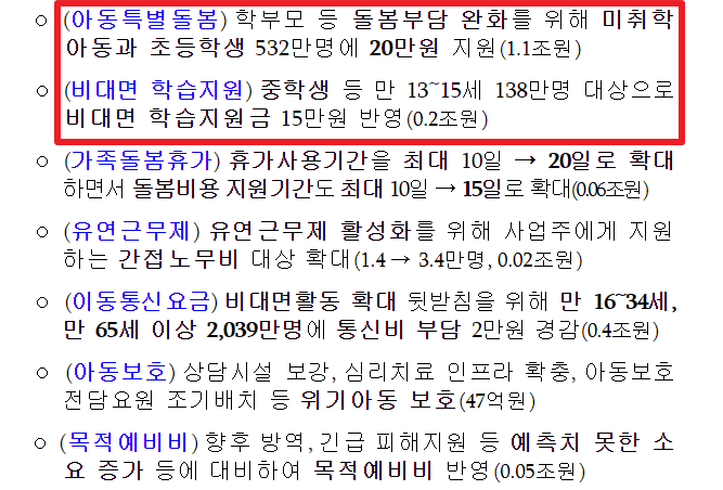 중학교 이하 아동 총 670만명에게 돌봄20만원과 비대면학습15만원 지원