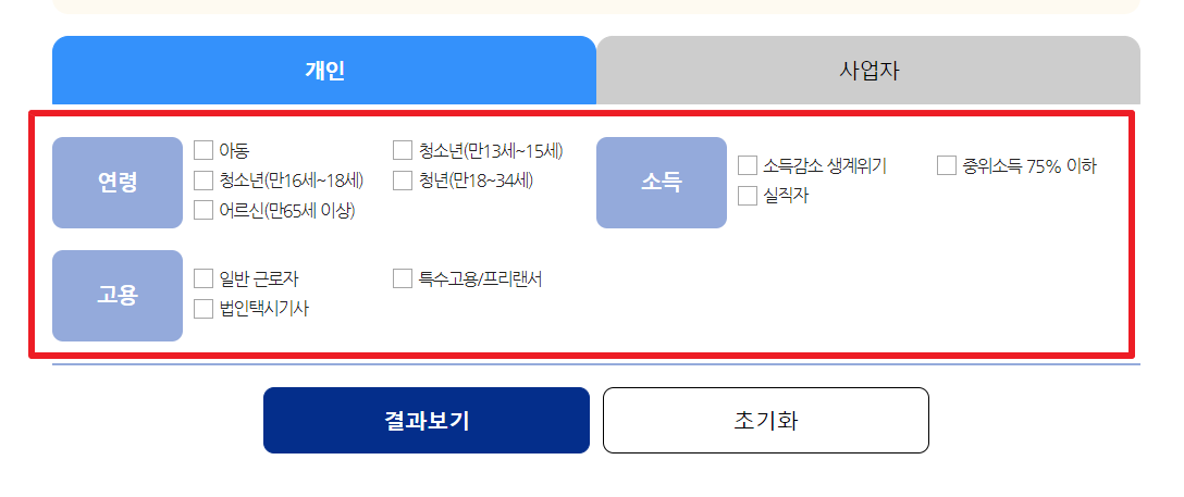 예를 들어서 청년(만18세~34세)으로 체크를 하고 결과보기를 누르면, 2만원 예상이라고 나오며,