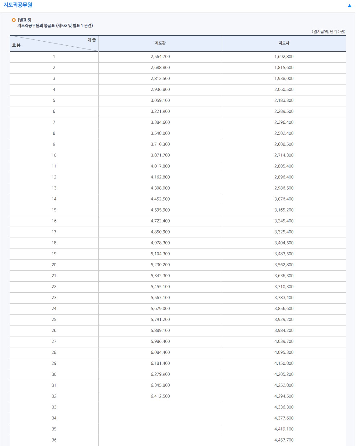 경찰 및 소방공무원도 인기가 많은 직종인데요. 9급에 해당하는 순경, 소방사의 경우에는 1호봉이 1,659,500원으로 일반직 9급 공무원과 같지만 6호봉(2,050,600)만 되도 벌써 일반직공무원(1,928,200)보다 12만원정도 높으며, 그 외에도 각종 수당으로 인해서 실수령액은 좀 더 많아지게 된다는 점 참고해주세요.