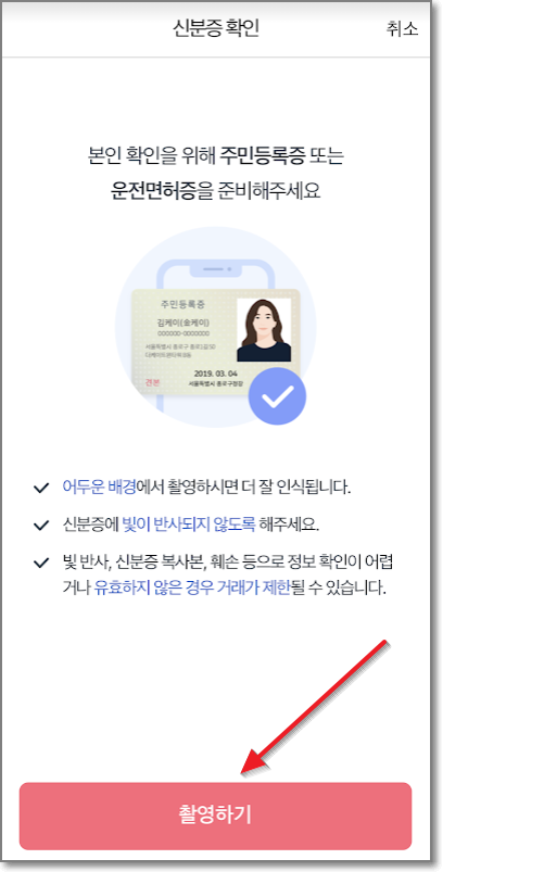 신분증 확인 절차가 나오는데요. 혹시 주민등록증이나 운전면허증에 주민번호 뒷자리 가린 스티커가 붙어있다면 제거하고 나서 촬영칸에 넣으시면 인식이 잘됩니다.