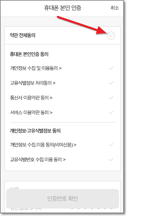 휴대폰 본인인증이 나오면 "약관 전체동의"를 누르고 이름과 주민등록번호 그리고 통신사를 고른 후 휴대폰 번호를 적고 "인증요청"을 눌러서 인증번호를 받습니다.