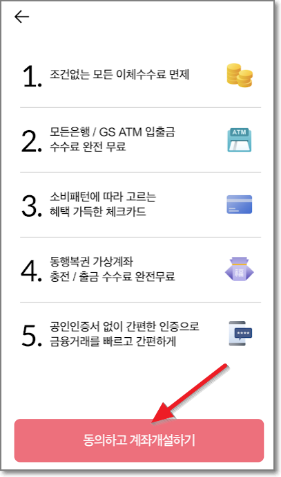 스마트폰에서 링크를 누르면 아래와 같이 ㅇㅇㅇ가 추천한 케이뱅크 시작하기가 뜨게 되는데요. 위 링크에 저를 추천인으로 하는 코드가 들어있어서 표시가 되는 것입니다. 이 코드로 가입해주시면 소정의 축하금을 받으실 수 있으며 제가 소정의 수수료를 받게 되는데 이는 블로그를 운영하는데 큰힘이 되니 눌러주시기를 공손하게 부탁드리겠습니다.~ 그리고 쭉 내려보면 모든 이체수수료 면제에 모든 은행 ATM기기 수수료 무료, 그리고 로또(동행복권) 계좌 충전 및 출금 수수료 무료 등의 혜택이 있습니다. 이제 "동의하고 계좌개설하기"를 누릅니다.