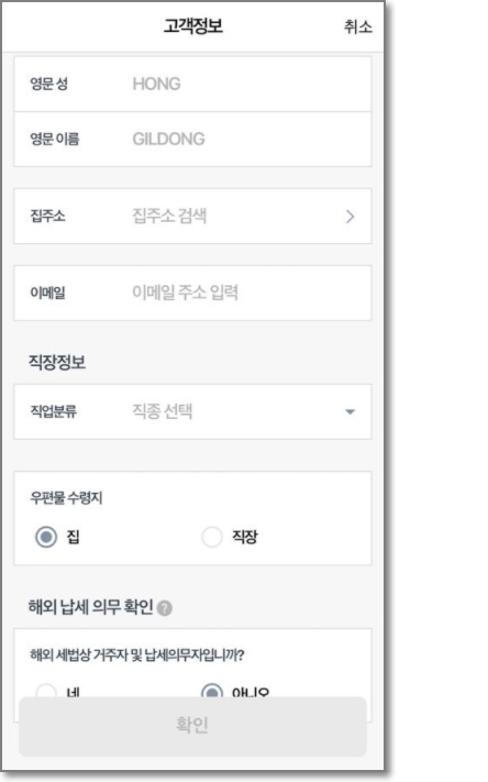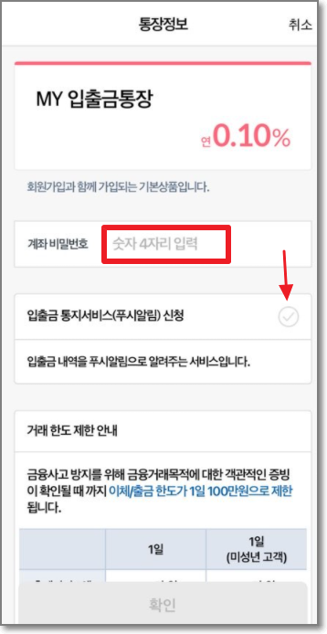 고객정보 입력란에는 필요한 정보를 모두 입력하고 계좌비밀번호를 설정한 후에 "입출금 통지서비스 신청"도 체크합니다.