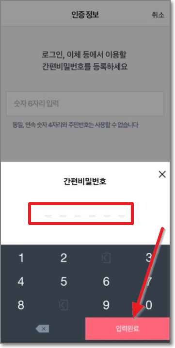 그리고 곧바로 이용약관에 동의를 하시고 6자리의 숫자로 이루어진 간편비밀번호를 등록하면 진행이 됩니다.