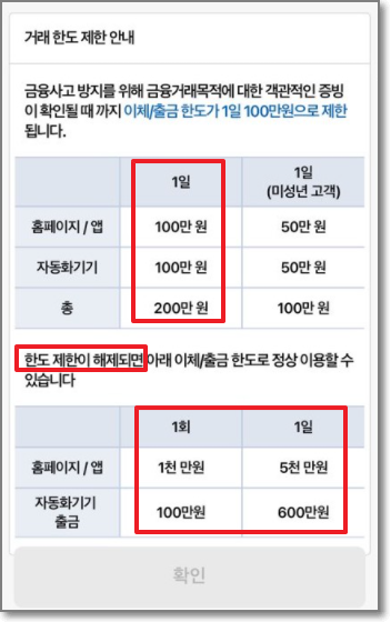 처음에 계좌를 만들면 "거래 한도 제한"이 걸린 계좌가 만들어지며 관리비고지서나 공과금 자동이체 실적등을 나중에 첨부하면 한도제한 계좌가 풀립니다.