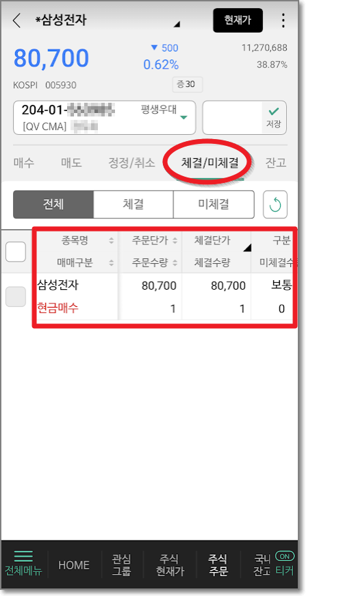 주문체결이 제대로 되었는지 확인