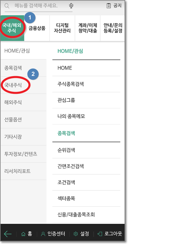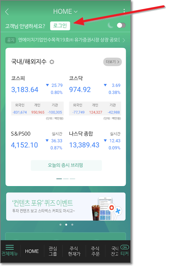 로그인을 했으면 화면의 왼쪽 아래에 보면 줄 세 개(전체 메뉴)가 있습니다. 캡처 화면에서는 환영 메시지가 가리고 있는데요. 금방 사라집니다. 뒤에 있는 줄 세 개를 누르고 전체 메뉴가 나오면 오른쪽 화면에서 처럼 "국내 주식"을 누릅니다.