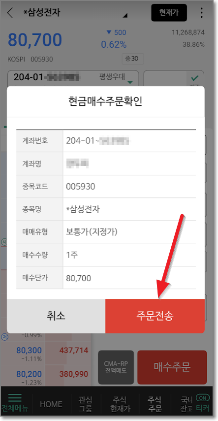 80,700원인 삼성전자 보통주를 1주 입력하고 "매수주문"을 눌러서 "현금매수주문 확인"을 확인하고 "주문전송"을 누릅니다.