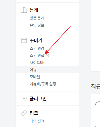 자 이제 티스토리로 가서 "관리" 페이지로 들어간 다음 "스킨편집"을 누릅니다.